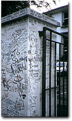 長いアビイ・ロードの通りのいちばん端にスタジオがある。すぐに目に入るのは、らくがきでいっぱいの門。多くのファンがここを訪れてはらくがきを残していくのだ。実は、門柱や塀は何度も塗りなおされているが、乾いたそばから新しいメッセージが書き込まれている。白いペンキの下には何万人分の思いが隠れているのだろう。
