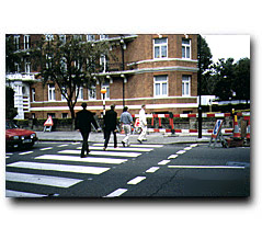 ![]() ●横断歩道 ビートルズのメンバーが最初のレコーディング以来、何度も渡ったであろう横断歩道。アルバム『アビイ・ロード』のジャケットのために4人が渡ったのは1969年8月8日。 アルバムが発売されてからは、いったいどれだけのファンが横断歩道を渡るためにここを訪れたことか。こんなに普通の横断歩道なのに、世界一神聖な横断歩道なのである。